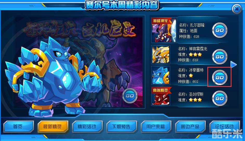 登录赛尔号,点击左上角的航行日志,选择最新精灵,接着点击冰拳墨特活动的GO按钮!