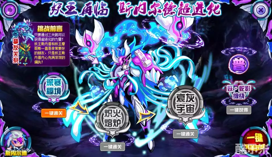 剧情结束后,打开活动界面。本次活动是斯内尔德进化成为斯内普的活动,大家需要完成深寒秘境、炽火熔炉、哀灰宇宙三部分挑战,才能获得进化精灵的机会。