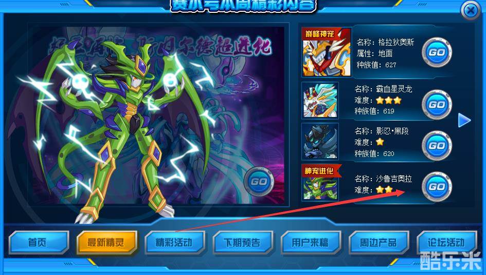 登录赛尔号,点击左上角的航行日志,选择最新精灵中沙鲁吉奥拉活动的GO按钮。