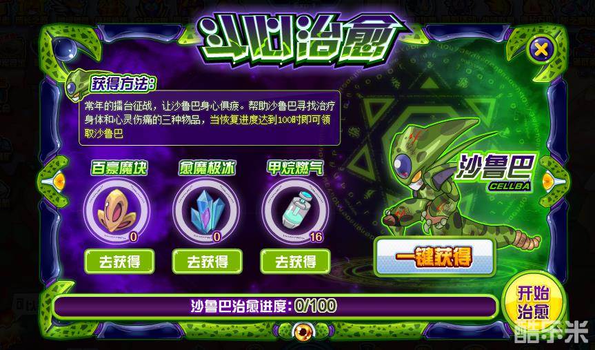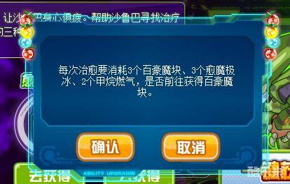 每次治疗需要3个百豪魔块、3个愈魔极冰、2个甲烷燃气。大家可以点击相应道具下方的“去获得”按钮,前去获得道具。