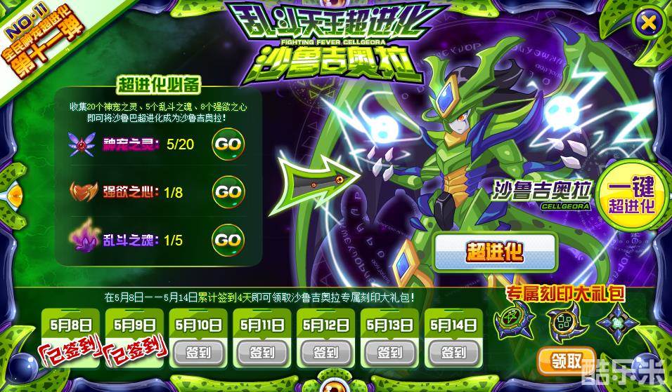 大家慢慢收集道具超进化吧!沙鲁吉奥拉的专属刻印大礼包可以通过签到获得,5月8日-5月14日期间,签到4天就可领取专属大礼包哦~