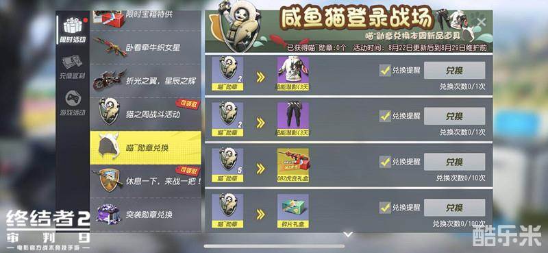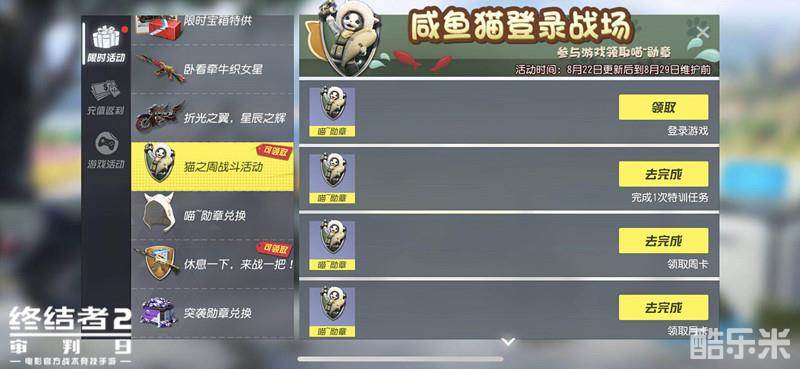 《终结者2:审判日》还同步开启了猫之周战斗活动和喵勋章兑换活动,完成登录游戏、随机战斗、特训、领取周卡等任务均可获得喵勋章,喵勋章可用于兑换包括超能潜影时装、虎贲礼盒、碎片礼盒在内的丰厚奖励。