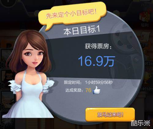 我们每天上线都会看到小云跑出来给我们定下每日目标,目标分为三个阶段,每完成一个阶段都会获得一定点赞数,奖励随比赛等级提升,在每个奖励完成后有个小窍门,电影在上映期间已经达到完成任务后立刻选择领取奖励,之后的电影票房会计算到下一个阶段上。完成后会获得终极奖励。如果每个阶段任务超过2小时没有完成的话就会重现开始计算,感觉挺坑的...任务第二天会进行重置,所以想完成任务那奖励的小伙伴要注意了。建议选择剧本时根据目前市场情况,选择高占比人群,这样可以提高票房,同时适度考虑放弃合作任务和随机任务。希望之后小伙伴们每天都能完成小目标吧!