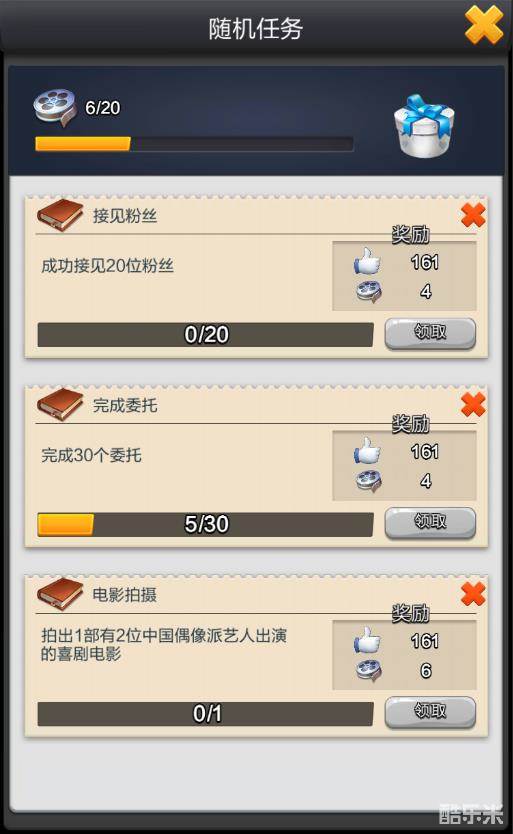 随机任务,顾名思义任务是随机的,任务最多同时出现3个,完成任务后可以获得点赞数和胶卷。每集齐20个胶卷就可以获得终极大奖,里面有大量点赞数、艺人合同和建材等奖励,还是挺诱人的。