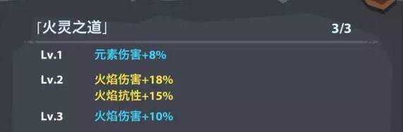 可以看到火之灵道中,1级为元素伤害加成,2级火焰伤害加成。