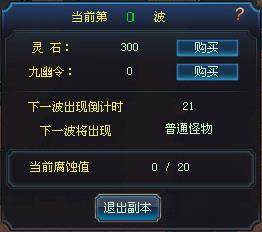 进入九幽殿后,右侧会出现小窗,提示当前怪物进攻波次、腐蚀值、下一波出现倒计时和下一波出现的怪物种类。同时,也可以快速购买灵石或九幽令。