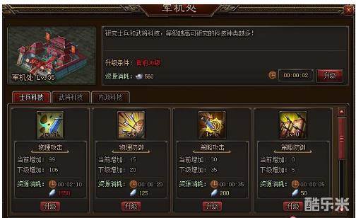所谓科技兴国在古代同样也适用,玩家可以在军机处升级士兵、武将以及内政三个科技,每个科技都可以增强你的军队实力,军队属性均衡发展,升级科技需要消耗一定量的水晶,水晶的来源主要是竞技场PK,只要你的实力够强你就能获得更多的资源培养你的军队!