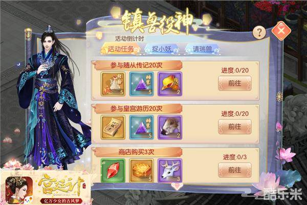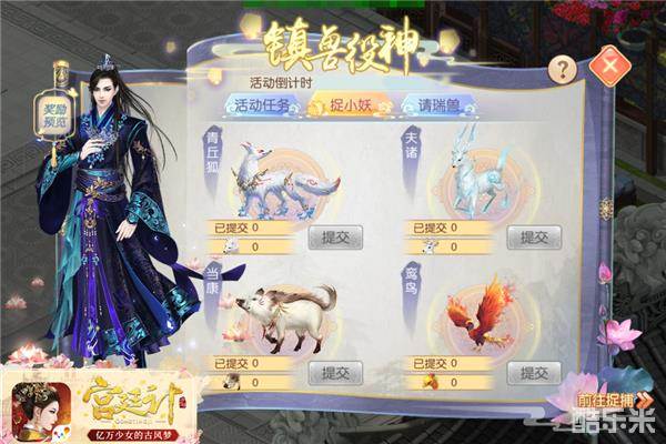 即日起至8月27日,小主可前往“活动”-“镇兽役神”处参与本次中元特别活动。七月半鬼门开,近日青丘狐、当康、夫诸、鸾鸟四大妖兽频频出没于宫中,亟待清理。小主们可通过完成系列活动任务(如:随从传记、游历等)来收集妖兽。此外,四大妖兽也常在景仁宫、坤宁宫、慈宁宫及侍卫所现身,每小时刷新一次,小主们可直接前往场景地图捕捉。
