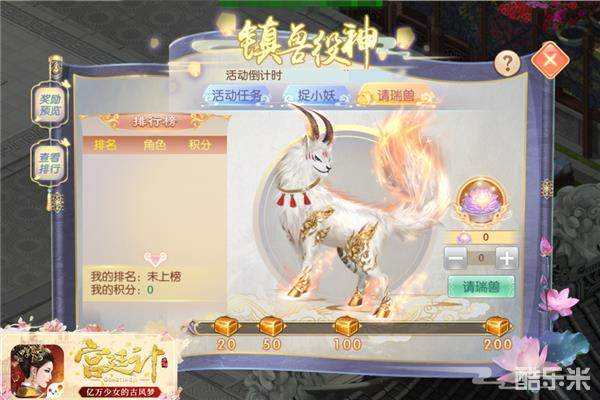 除了捕捉小妖,中元节还有放河灯的习俗。活动期间,小主完成系列任务及上交小妖中获得的活动道具“三清莲灯”可用于请求瑞兽白泽降世,普度众生,逢凶化吉。每请一次瑞兽将供奉一盏莲灯,获得1积分及随机道具奖励,积分累计到一定数值时可开启积分宝箱。活动结束后,积分榜前200的小主还将获得惊喜奖励,无双珍宝、特殊称号、橙宝精华等众多好礼等着你!