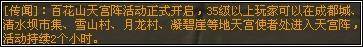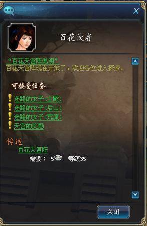 2.玩家可在成都城【365.145】及其他主要城镇处找到百花使者,可通过百花使者接到相关任务后传送至百花山天宫阵中的阵前广场(与阵前广场内的百花使者对话将被传送回凝碧崖),阵前广场与天宫阵内不可PK、不可摆摊。