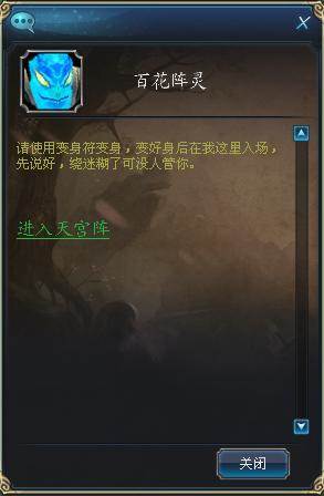 4.使用变身卷变身后,在阵前广场内找百花阵灵,进入百花山天宫阵,如下图所示: