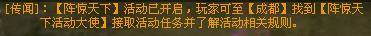 2.玩家可在成都城【366,100】处及其他主要城镇找到NPC守阵人【阵惊天下活动大使】,并到该NPC处领取BUFF【灵气护体】然后进入对应的阵法。