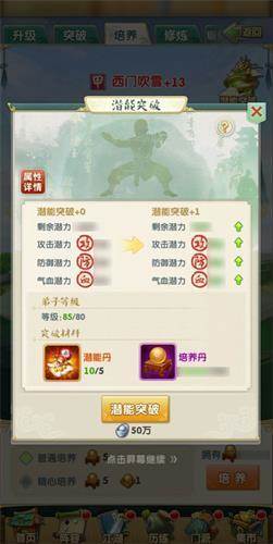 掌门或门下弟子在进行潜能突破后,除了能获得少部分的攻击、防御、气血潜力外,还能获得大量的剩余潜力,剩余潜力则可以随意分配至攻防血潜力。已分配的潜力将按照一定比例转化为弟子的基础属性,总的来说,玩家可以通过潜能突破,来获得潜力,进行大幅度提升攻击、防御和气血。
