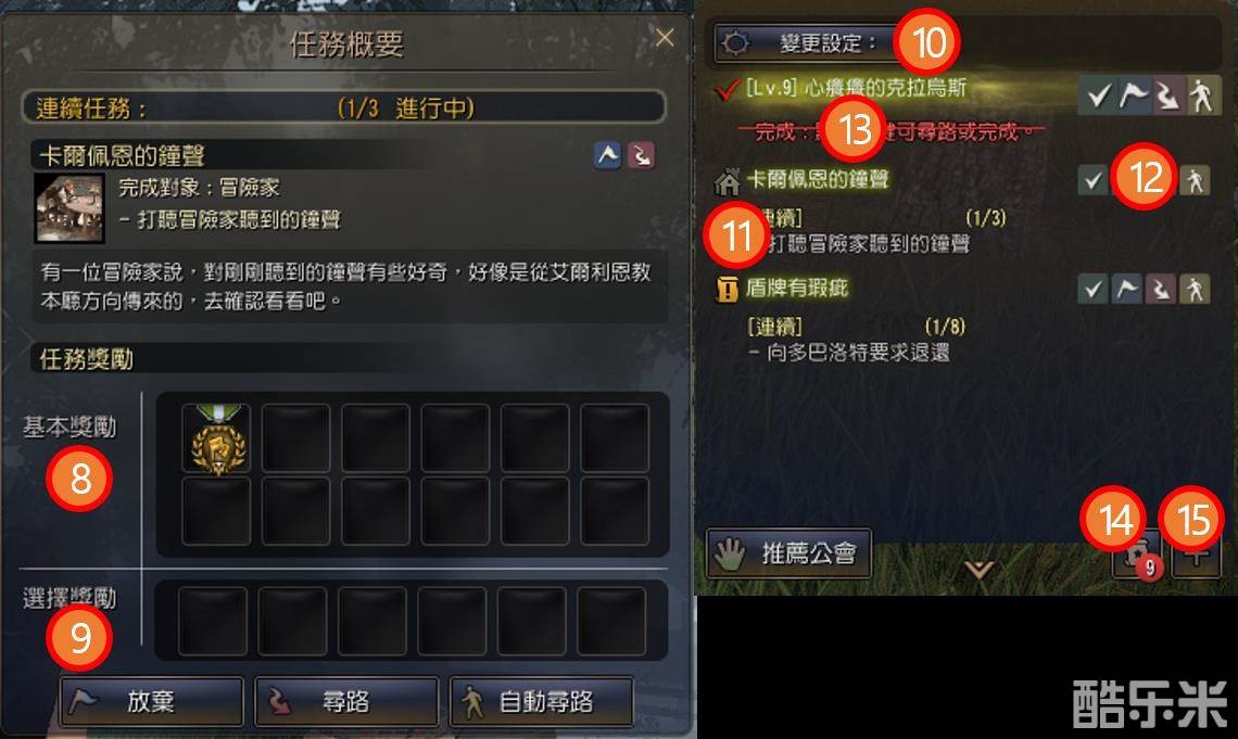 13.完成的任务:完成任务条件后将以红线标示。 可透过与完成NPC对话领取奖励。