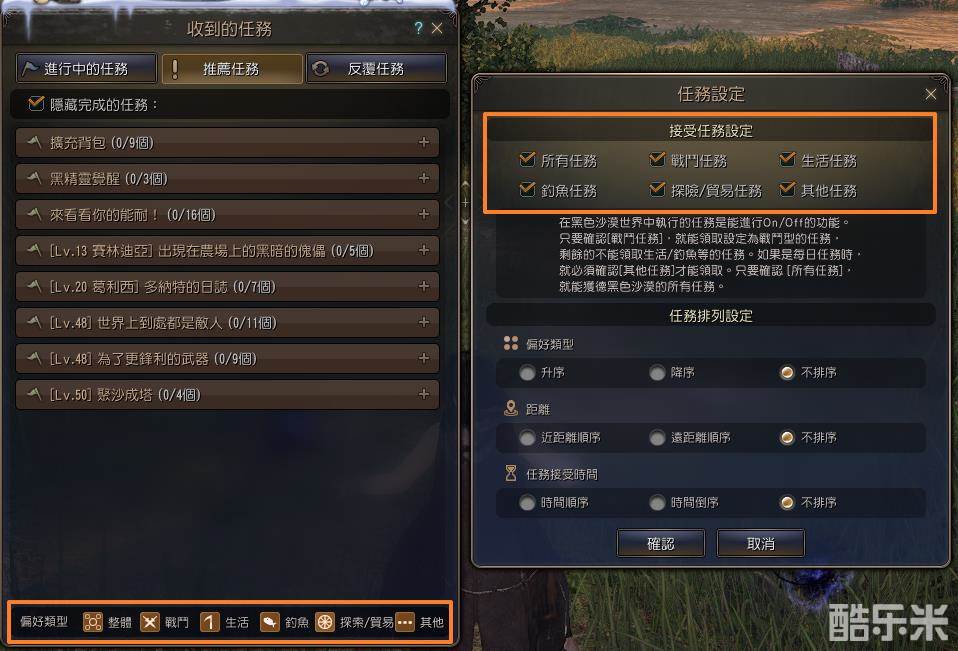 ▲ 点选任务窗口下方的筛选或任务工具集里的设定,可以只接自己想要的任务类型。