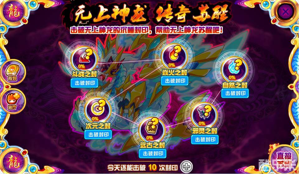 无上神龙有6个封印,分别是斗神之封、焱火之封、次元之封、远古之封、邪灵之封、自然之封。大家需要用相应封印指定属性的精灵攻击才有效果。每个击破程度达到100%就算完成。每天有10次击破封印机会。这里的每次击破封印,都是根据你的伤害来算百分比的,比如你打出2000伤害,那就是20%的程度!这关一键过关的价格是198钻石。