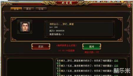 “被征服”就是当了别人的属臣。当属臣其实没什么不好的,在这个笑贫不笑娼的时代,赚钱才是硬道理。看见下图的“跪拜”按钮了没?只要你点一下,可以随机得到数量不等的金、银箱子。别小看这些箱子,土豪也全靠这些箱子雄起的。对主公最多可以进行三次跪拜,而且每次“跪拜”之后的15分钟内不可以再次“跪拜”。当然,什么时候你的实力比主公强了,你就可以点击下图中“反抗”按钮,直接翻身做自己的主人,这个可是没有奖励的。