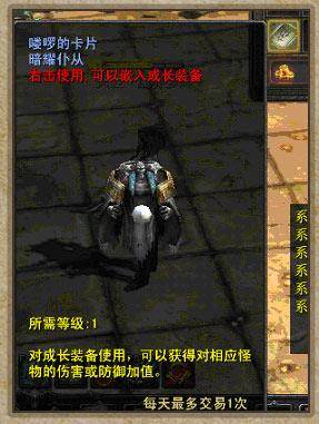 鉴定封魔石有一定几率获得“怪物卡片”,“天性之魂”或鉴定失败。 怪物卡片:怪物卡片可以插入成长装备(紫色品质,包括武器和防具)中,对装备进行提升。