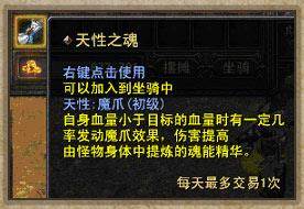 天性之魂:天性之魂可以加入到坐骑上。当玩家使用带天性的坐骑时,可以在一定几率内获得天性的加成。