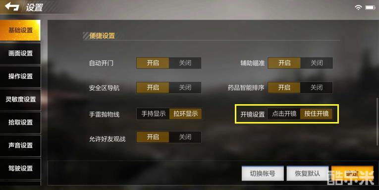 在介绍栓狙时首先要告诉大家新版本中的一个改动,就是在开镜设置上玩家有了更多的选择,之前我们都是点击开镜,按下之后镜头就会打开并保持开镜状态,而在新版本中多了一个按住开镜的选择,也就是玩家想要保持开镜状态就需要一直按住开镜键,那么这个设置究竟好不好用呢?