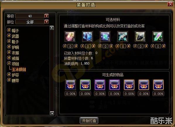打造界面分为左右两个部分,左边选择装备,右边显示材料与打造可能得到的装备属性。可以通过选择等级、部位,快速定位要打造的装备。
