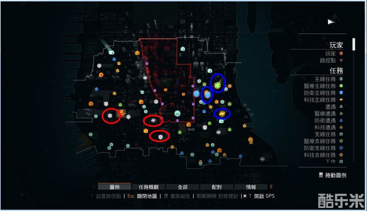大家可以看到右边的图例,绿色的梅花就是医疗主线,黄色的闪电就是科技主线,蓝色的盾牌就是防卫主线,这些任务也就是这游戏的副本,那左边我用红色圈圈表示的就是我打过了,图案会变成灰色