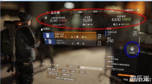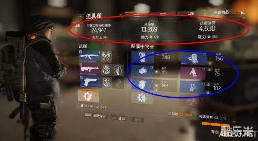 先讲红色圈圈,分别是主要武器每秒伤害(DPS),生命值,技能强度