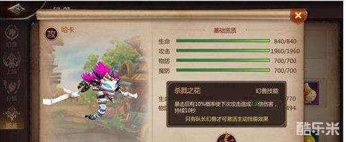 暴击流的游侠推荐将橙色幻兽中的“哈卡”设置为队长,因为幻兽上阵之后,首先就是会提升角色的生命值、攻击、物防及法防。而哈卡是一个攻击型幻兽,对角色的攻击加成无疑会比其他类型的幻兽高,如1级的哈卡能够提升角色63点攻击力,而同样是橙色幻兽,1级的灵魂医者只能提升角色45点攻击力,不仅如此。哈卡设置为队长之后,会为角色提供一个幻兽技能“杀戮之花”,技能效果就是暴击后有10%的概率使下次攻击造成1.8倍伤害,持续十秒,提升的伤害是很恐怖的,别看只有10%的概率触发,对于暴击流的游侠来说,触发的概率还是相当高的。