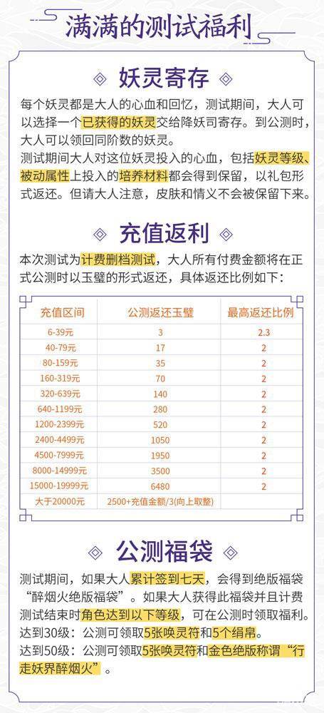 测试期间,《神都夜行录》还会给玩家带来满满福利活动。首先,测试推出妖灵寄存,玩家可选择一个已经获得的妖灵交给降妖司寄存,到公测时可领回同阶数的妖灵。其次是充值返利,本次测试为计费删档测试,玩家付费金额会在公测时以玉璧的形式返还,比如充值80至159元的玩家,公测返还玉璧为35。最后玩家累计签到7天,还可获得绝版“醉烟火绝版福袋”,达到指定等级即可在公测领取唤灵符等道具奖励。