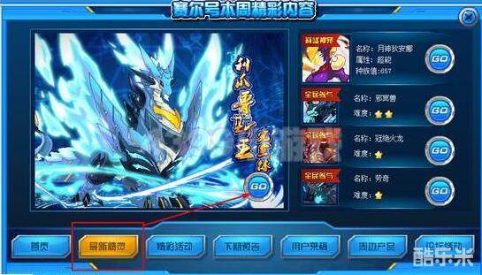 登录赛尔号,点击左上角的航行日志,选择最新精灵里面的利爪鲁斯王完全体活动,点击GO按钮前去参加。