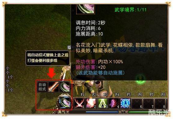 解完个打木桩的任务之后,玩家就可学得招门派武学,游戏里的武学是属于自动习得,只要玩家到达学习的等级,就会在升级时自动学习到新的武学。另外,一开始学到的初阶武学,可以设定成为自动招式,也就是快捷栏很左方那一格(预设为普通攻击),当玩家将设定换成初阶武学之后,以后攻击就会以初阶武学取代普通攻击。已经学习到的武功可以找门派武学导师加以提升,由于提升武学得花费银两与角色本身的经验值,是要先冲等呢?还是先冲武学呢?玩家得好好的斟酌一番啰!