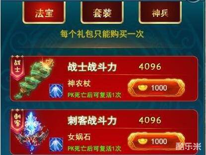 可以看到商城一共有三种东西出售,分别是法宝、套装、神兵。