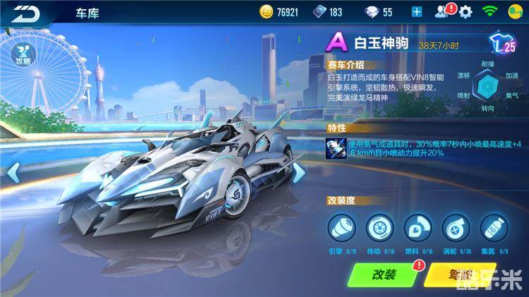 白玉打造而成的车身搭配VIN8智能引擎系统,坚韧散热,极速瞬发,完美演绎龙马精神。白玉神驹的各项属性较为均衡,其中耐撞、加速和转向性能较为突出,是一辆综合性能很强的A车。