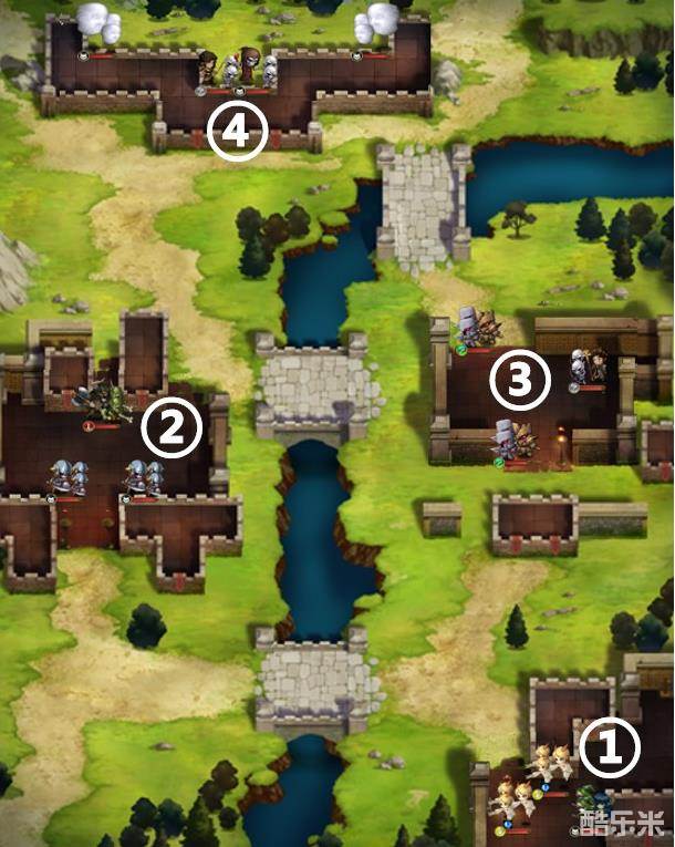 清理完①和②的敌人,汇合前往③位置,利用步兵及法师清理掉两个岩石傀儡,BOSS就是白送的了。