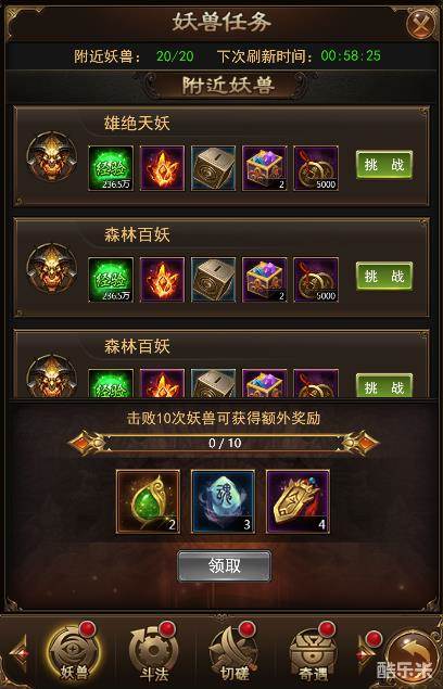 1)每天可以击杀20次妖兽任务;完成10次后可获得额外奖励;