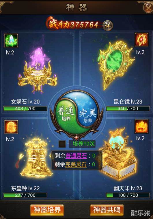 升级条件:消耗灵石进行培养。普通培养每次可以培养一件神器,完美培养可以一次培养多件神器。