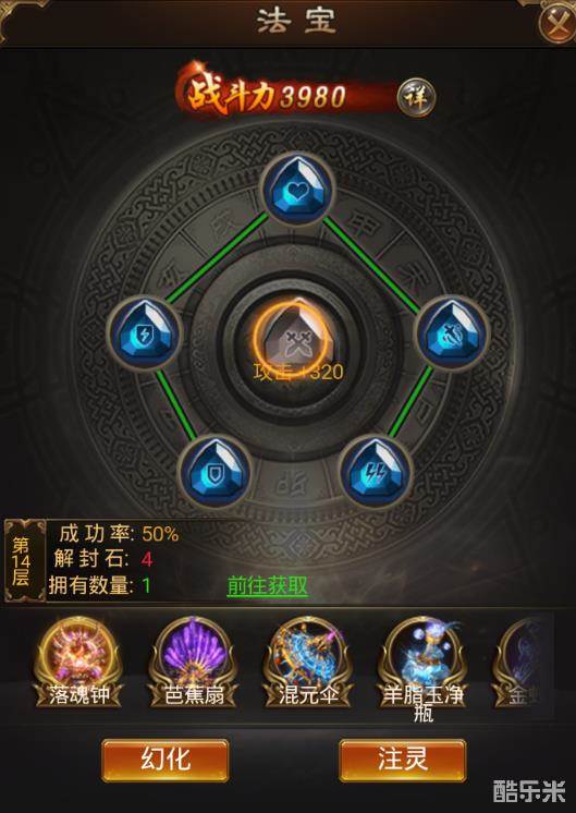 法宝注灵:消耗法宝灵气为法宝注灵,每注灵到一层中的最后一个时,需要消耗对应的法宝解封石才能解封下一层。