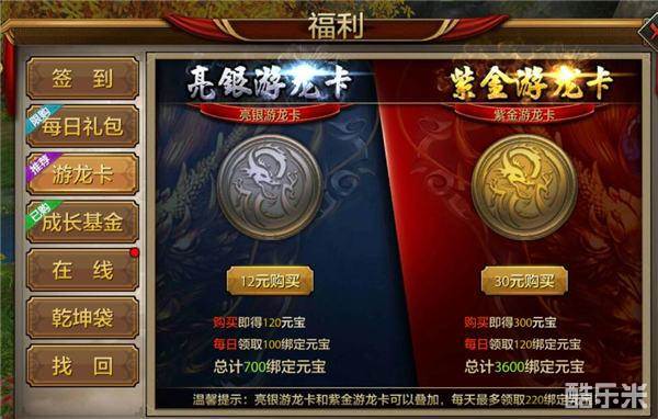 游龙卡通俗点来说就是周卡和月卡。亮银游龙卡,周卡购买需要12元,购买后立即获得120元宝,之后7天,每天可以领取100绑定元宝,共计700绑定元宝。紫金游龙卡,月卡,需要30元购买,购买后立即获得300元宝,之后30天每天可以领取120绑定元宝,共计3600绑定元宝。长期玩游戏的小伙伴们必备哦。
