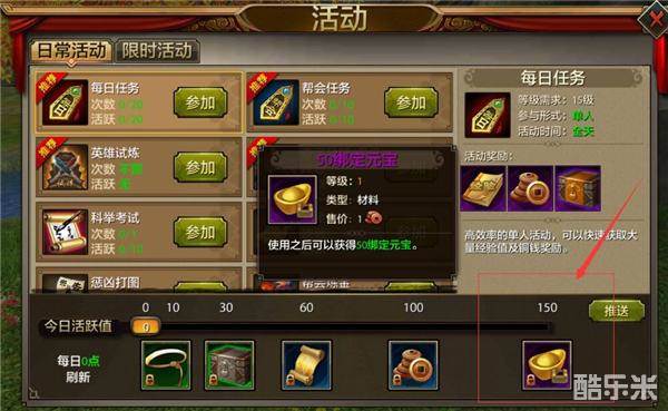 天龙八部手游中,每日都有活跃值玩法,根据玩家当日参加各种活动获得的活跃值,给予奖励,每日活跃值150点的奖励是50绑定元宝,每日0点刷新奖励。
