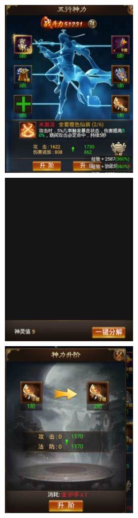 在神力玩法中,共有五大神力。分别是:锐金神力、巨木神力、洪水神力、烈火神力、厚土神力。每个神力都可以穿戴对应的仙装,当你集齐6件橙色仙装后,就可以激活神力的专属技能。同时在拥有仙装后,多余的仙装可以分解成神灵值,为你的仙装进行升级。而多余的橙色仙装可以为你的同位置橙色仙装进行升阶(注:只有橙色仙装可以进行升阶)