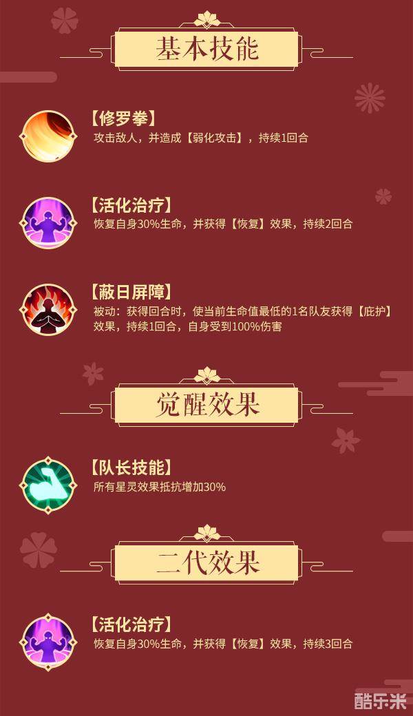 火阿修罗觉醒真名非天,对脆皮星灵有不错的保护能力,被动的存在使其不用消耗回合数地为血线最低的队友星灵提供庇护,代替承伤;活化治疗可以在当回合和接下来数回合带来血量恢复,提高持续作战能力;弱化攻击可以有效防止敌方输出星灵暴走,以攻代守。