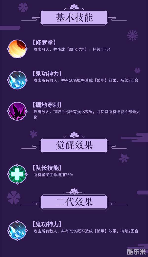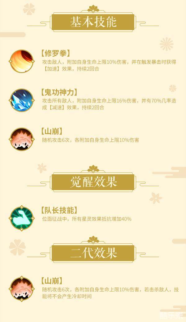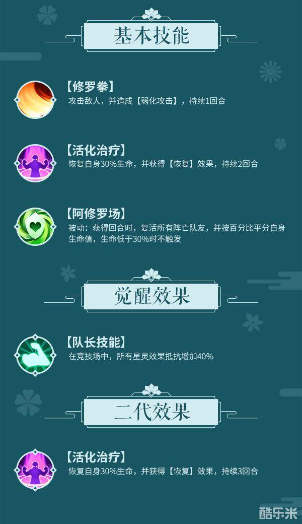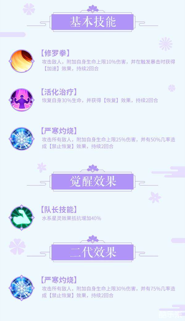 水阿修罗觉醒真名千眼,无论是一技能还是大招都附带自身生命上限的伤害,既有肉又有伤害;一技能触发暴击时额外的加速效果,提供更多出手机会;二技能可以加血,保证自身血线健康;大招的群体禁止恢复能在在一定回合内限制敌方全体目标回血。