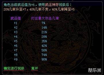 右键点击背包栏中的“武运神符”或“武运仙符”,系统会弹出确认对话框,并提示玩家进行祝祭后,武运值提升或下降的几率: