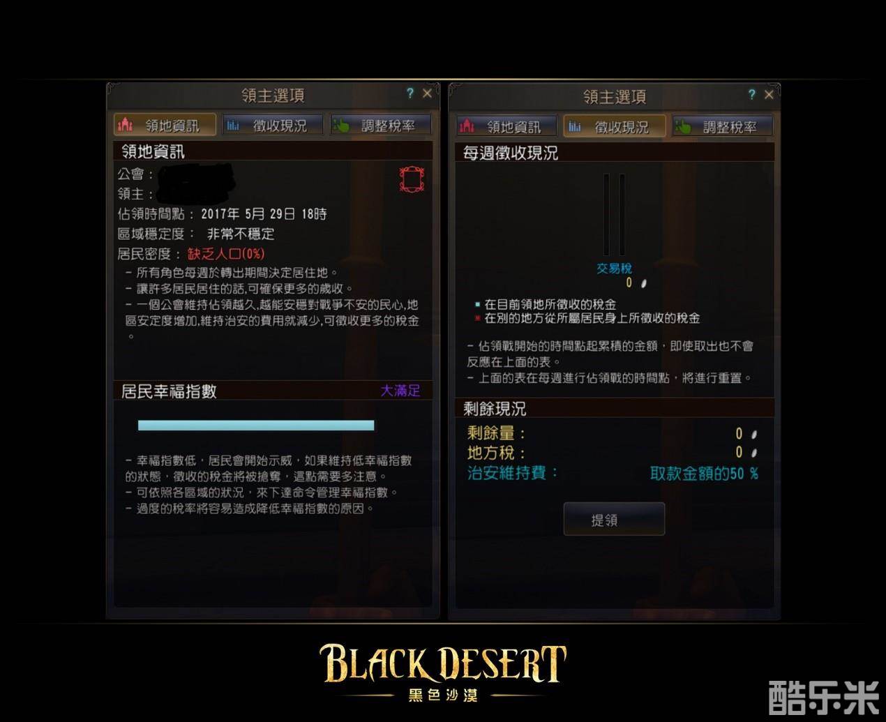 可以看到从占领战开始所累积的交易税金额。下个占领战开始时即会初始化,以及收取的税金可以透过”取款”的清单来获取。但是以地方税收取的税金无法获得,因为地方税是领主交给城主的税金。