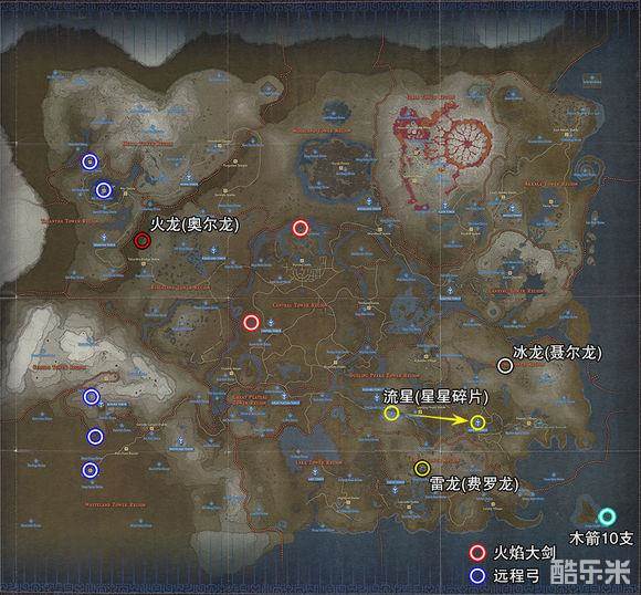 图上有取得5把远程弓地点,刷amiibo得到的一心之弓和黄昏之光弓很好用,但是稀有度你懂的。