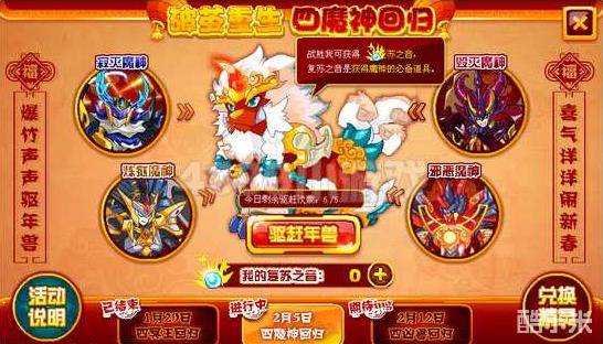赛尔号复苏之音是活动【赛尔号四大魔神精灵回归】中的道具,每天5次挑战机会,系统会随机安排四大魔神精灵挑战年兽,打败年兽可获得不同数量的复苏之音。