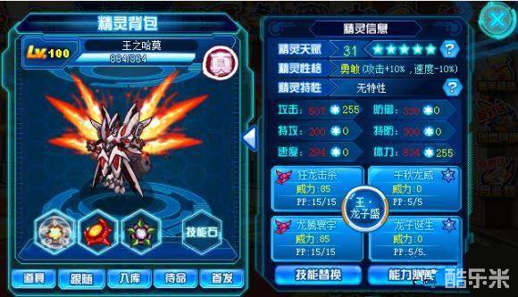 龙子诞生:属性技能,全属性+1,体力高于对手时翻倍,王哈的高体又一次起了作用。恢复最大体力的二分之一让王哈起死回生,下次攻击忽略对手防御的45%配合狂龙击杀简直秒天秒地秒空气,这个技能既保证了王哈的生存,又保证了王哈的输出。必带!