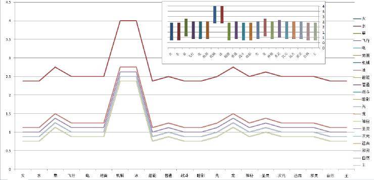 火战斗在邪神的时代曾火了好一段时间,不过现在不景气了。我们可以看到克制面机械系和冰系那里很高,凡是带有着2个属性的都是2倍以上的克制。2个单属性更是达到了4倍。不过由于火和战斗有些克制和微弱相抵消,并没有造成更高克制。拥有2个4倍克制还是不错的,并且机械系在以后可能会有发展。不过冰系却是冷门属性。总的来说在高倍打击这方面还算过得去。在低倍克制里面火战斗就显得并不优秀了,低倍克制之中只有2个1.5,而其他的倍数都很低,显然的发展后劲不足:在未来也不会出现火战斗特别能打击的双属性。微弱的属性都在0.75到1的区间之内,从低倍来讲火战斗是相当的优秀,没有0.5的低倍。综上所述,在输出方面火战斗算是上乘的,不过随着时间的推移,双属性种类越来越饱和,火战斗的优势会一点一点的缩小。