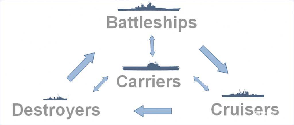 石头-剪子-布是一个经典的游戏,石头赢剪子,输给布;布又输给剪子。当然,WOWS也是基于这个简单的原则,信不信由你,历史上也是遵循这样简单的原则,嘛,至少粗看起来是这样的。那游戏是个什么情况呢? 巡洋舰克制驱逐舰,战列舰可巡洋舰,然后战列舰又会被驱逐舰克制(嘛,不相信这个的看看苏里高,美帝驱逐舰如何教扶桑山城做人)。那航母能克制谁呢? 航母克制所有船(在远距离),一旦近了身,所有船都克制航母。 基本原则就如图所示啦