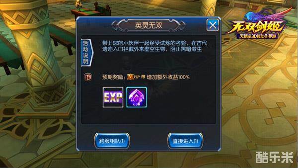 参加英灵无双的方式有两种:一种是在主城内通过点击右上角“活动”按键,而选择英灵无双后即可自动寻路至NPC“神父”加入挑战。不论是固定小队还是系统匹配的小队,从够强够多够凶狠的敌人、够炫够劲爆的无锁定技能操作中,英灵无双中,你将感受到无锁定真动作手游的刺激和团队协力作战的无穷乐趣!